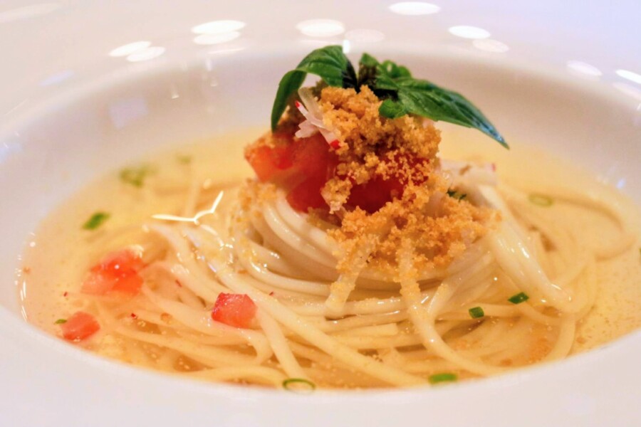 อุด้งเย็นในซุปใส่ะเขือเทศ เสิร์ฟพร้อมคาราสุมิ (Chilled Udon, Tomato Consommé, Karasumi)จากประสบการณ์ส่วนตัวและแรงบันดาลใจในการสร้างสรรค์ เชฟได้นำเส้นอุด้งแห้งจากจังหวัดนางาซากิมาจับคู่กับซุปใส่ะเขือเทศรสละเมียด และตกแต่งด้วยคาราสุมิ หรือที่รู้จักในภาษาอิตาเลียนว่า Bottarga ซึ่งเป็นวัตถุดิบชั้นเลิศที่ได้รับการยกย่องทั้งในวัฒนธรรมญี่ปุ่นและอิตาเลียน